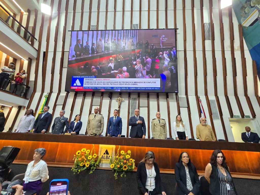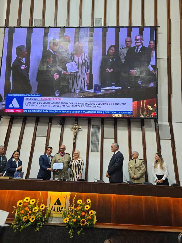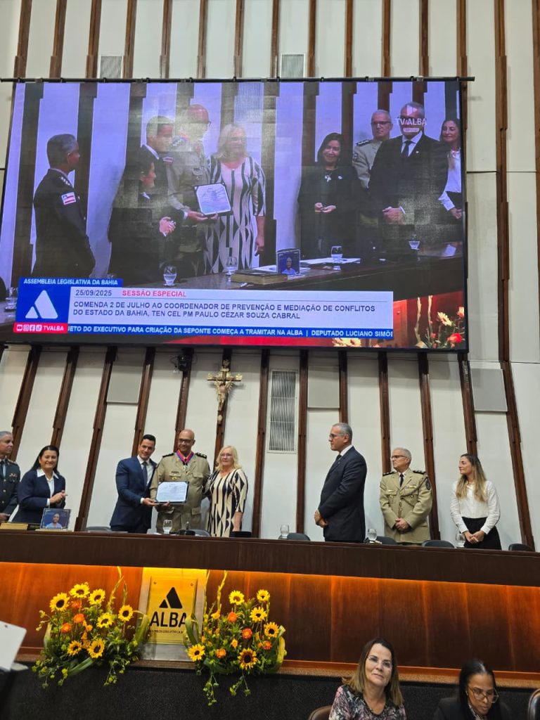 Prestigiamos a outorga da Comenda 2 de Julho ao Coordenador de Prevenção e Mediação de Conflitos do Estado da Bahia, tenente-coronel PM Paulo Cézar Souza Cabral. A defensora pública e coordenadora da Especializada de Família e Sucessões, Suellen Bury, representou a DPE/BA na sessão especial.