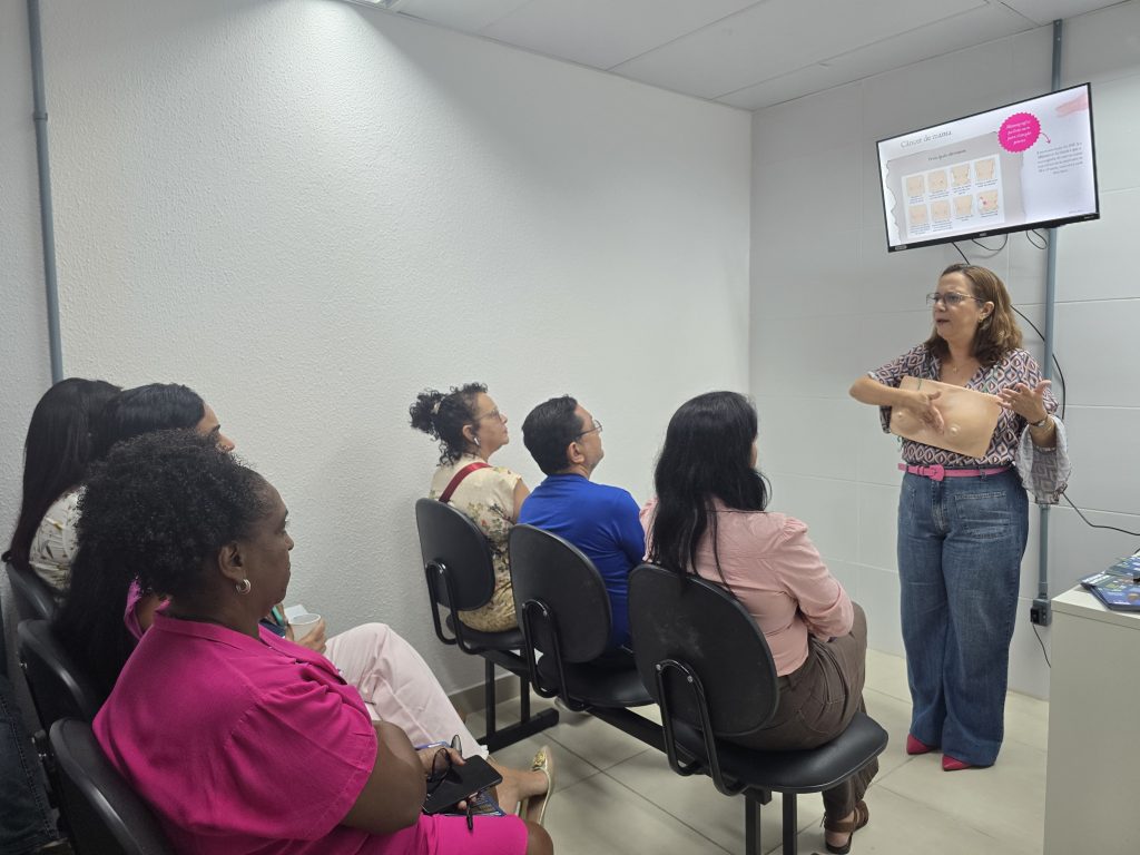 “Um dos exames que nós, mulheres, temos que fazer é o de conhecer o nosso corpo: ficar na frente do espelho, olhar a mama, levantar os braços, saber o próprio formato e ver se tem simetria, fazer movimentos circulares em volta do mamilo com as pontas dos dedos,  verificar se tem algum nódulo palpável para perceber se tem alguma alteração. O autoexame é para que possamos conhecer o nosso corpo, mas o padrão ouro para detectar e diagnosticar o câncer de mama é a mamografia”, ensinou a professora, que levou o simulador da mama para mostrar como faz o autoexame.